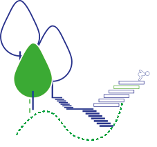 Le public est réparti en plusieurs groupes. Chaque groupe reçoit en plus de son équipement audio un plan lui proposant un itinéraire. 4 repères sous forme de pictogrammes donnent des points d’observation à retrouver. Par 3 reprises au cours du spectacle le public sera amené à se déplacer. Un signal sonore lui indiquera, le moment venu, qu’il peut poursuivre son chemin et passer à l’étape suivante. Nous initions des changements de perspectives pour percevoir l’espace, les pleins et les vides, un peu comme une chasse au trésor.
